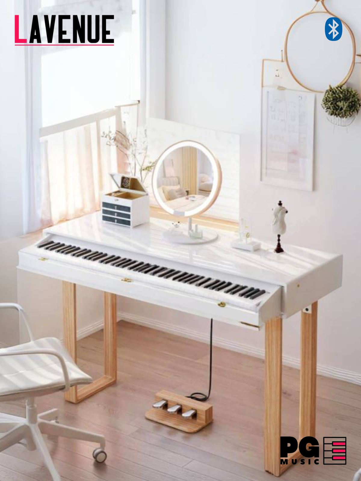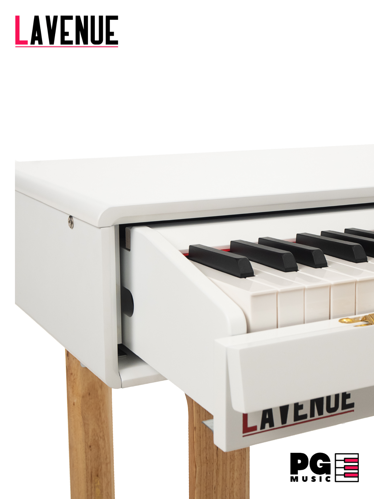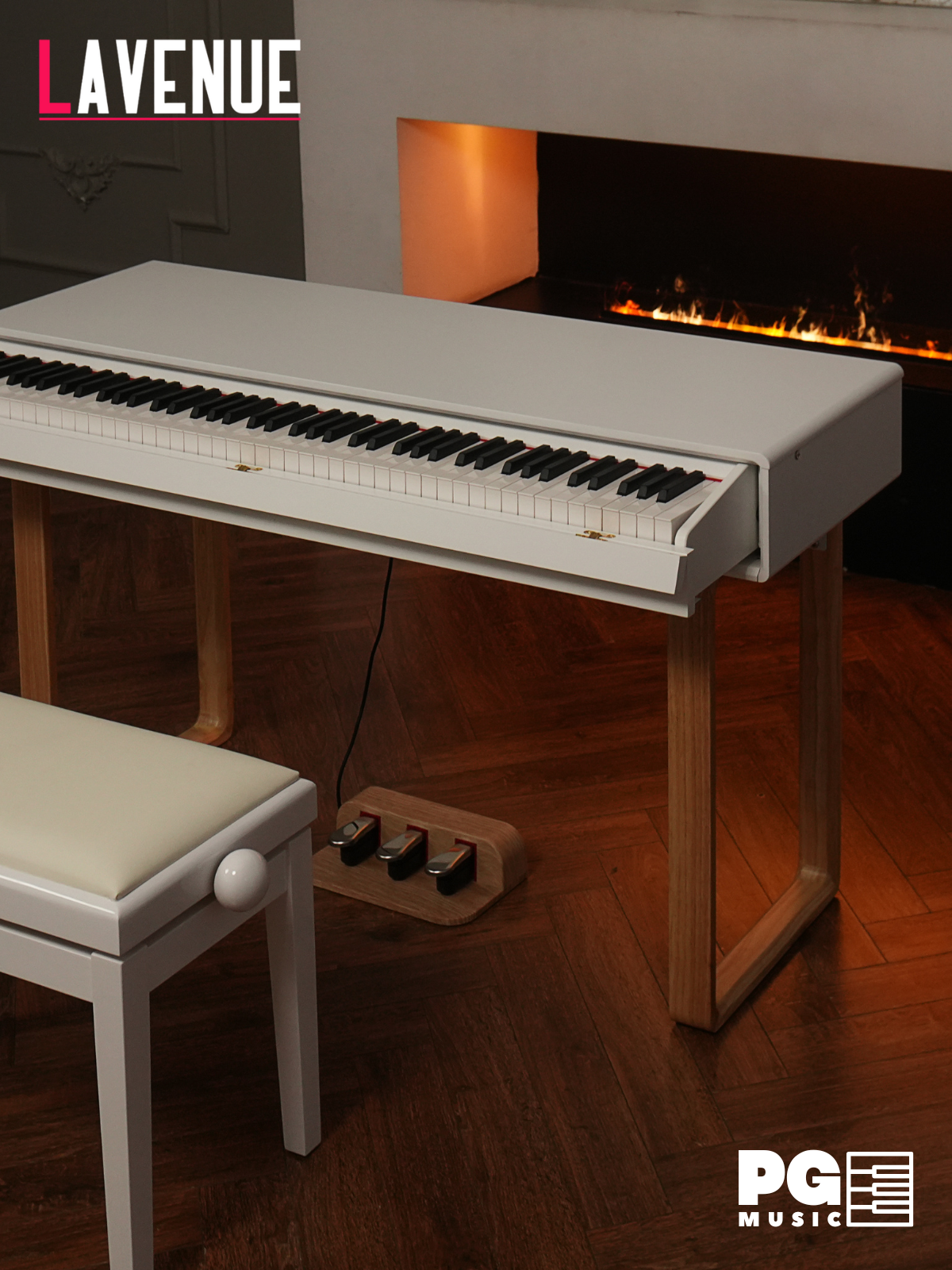 Интерьерное цифровое пианино с механизмом выдвижной клавиатуры и педальным блоком из трёх педалей рояльного типа. Корпус белого цвета выполнен в современном, эргономичном дизайне. Интерьерное цифровое пианино с механизмом выдвижной клавиатуры и педальным блоком из трёх педалей рояльного типа.