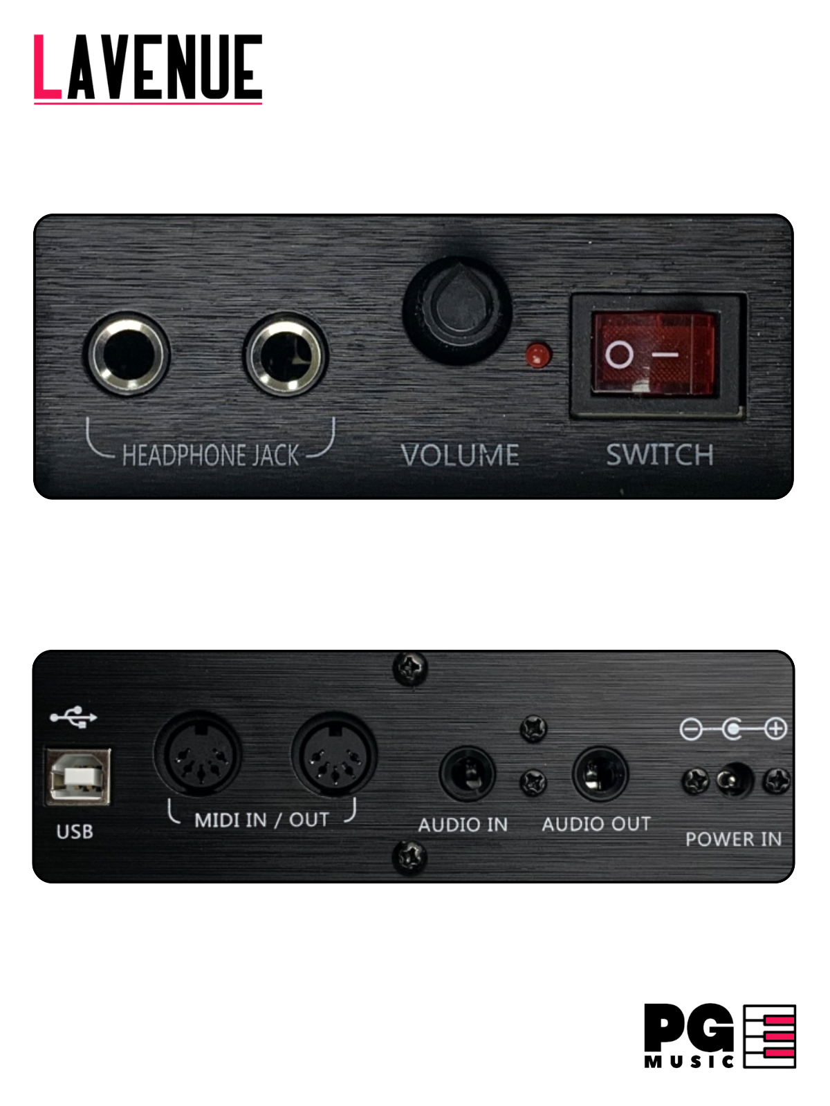 Разъёмы Audio IN и Audio OUT позволяют подключить инструмент к дополнительному звуковому усилению, а два разъёма под наушники дают возможность музицировать, не мешая окружающим.