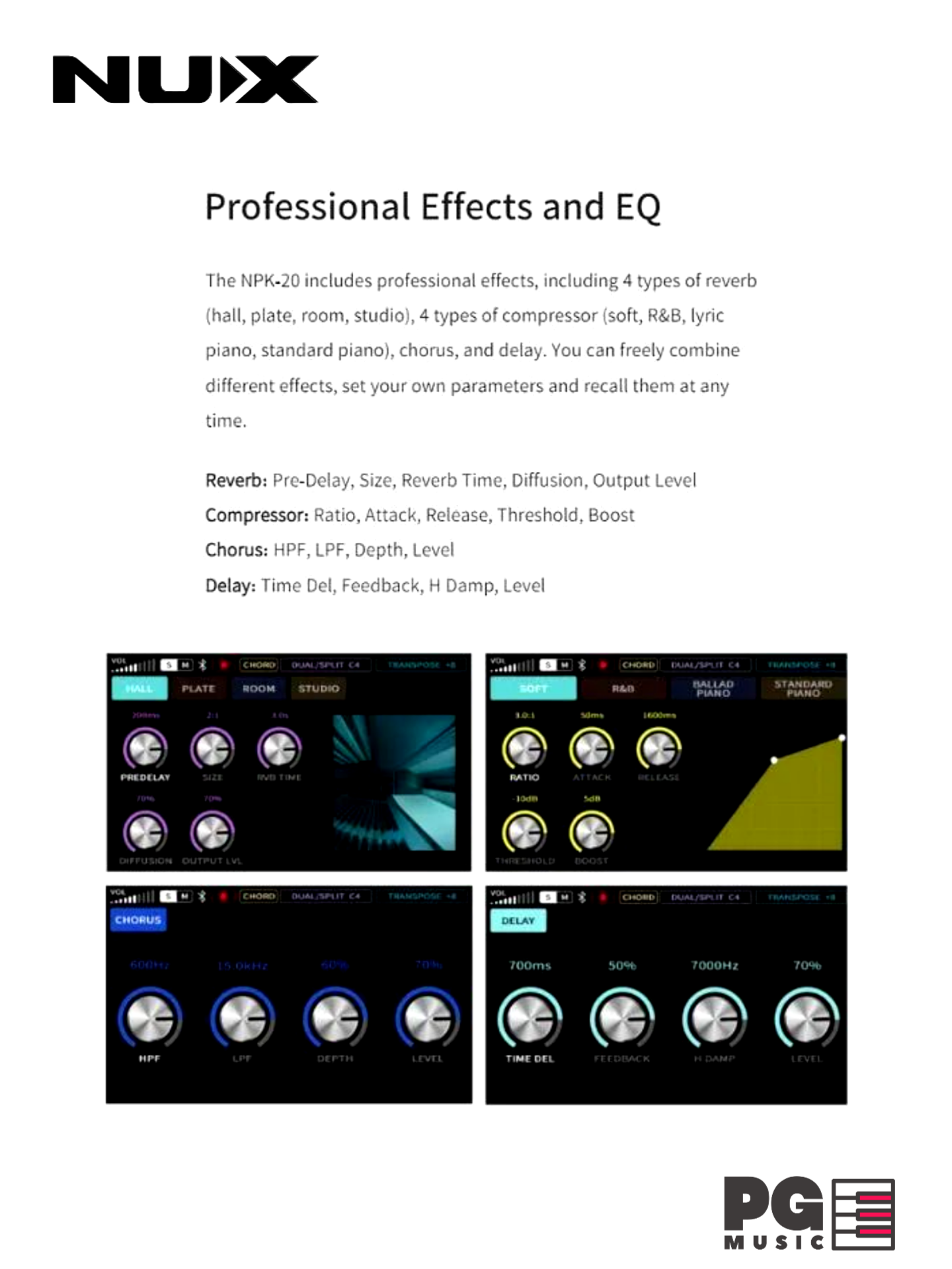 В NPK-20 используется взвешенная взвешенная клавиатура с тройным датчиком WKJ-03 (со спусковым механизмом и клавишами из искусственной слоновой кости и черного дерева), а кривые касания клавиш и звуковой дизайн дополнительно оптимизированы. Более профессиональная обработка была сделана для нажатия клавиш с точки зрения прижимной силы, распознавания отскока, распознавания легато и т. д. Ощущение спуска и баланс черных и белых клавиш также стали более равномерными. Кроме того, в NPK-20 добавлено шумоподавление. Модель отвечает всем требованиям игры и исполнения, а также создает ощущение настоящего акустического рояля. Обеспечение точного и настоящего звука рояля может быть сложной задачей. Nux добились этого для NPK-20, сэмплируя изящный и выразительный немецкий девятифутовый рояль.Они не остановились на одном звуке - NPK-20 включает в себя в общей сложности 271 высококачественных тембров, разделенный на 7 групп на верхней панели. Все звуки были тщательно обработаны и оптимизированы, в результате чего подборка звуков стала одновременно мощной и богатой. Звуки можно выбирать или накладывать интуитивно на панели, например звук фортепиано, наложенный на окружающий звук оркестра. Подключив компьютер к разъему USB MIDI, вы можете использовать инструмент как MIDI-Клавиатуру. Функция записи, метроном являются must-have для любого клавишного инструмента и, конечно, присутствуют в этом фортепиано. Вес фортепиано составляет всего 11,9 кг. Его легко взять с собой на выступление или природу. Мощные встроенные динамики 10 х 2 Вт легко озвучат любую квартиру или небольшой зал.