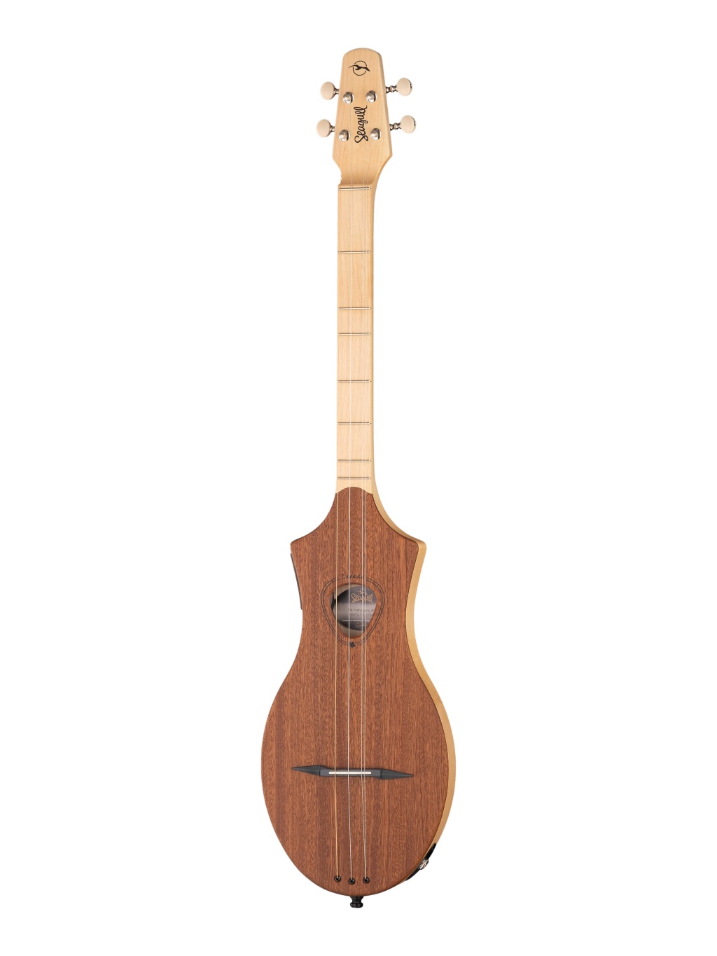 Seagull M4 имеет кленовый корпус из трех частей, бридж Tusq в форме усов, компенсированные порожки и винтажную открытую колковую механику.