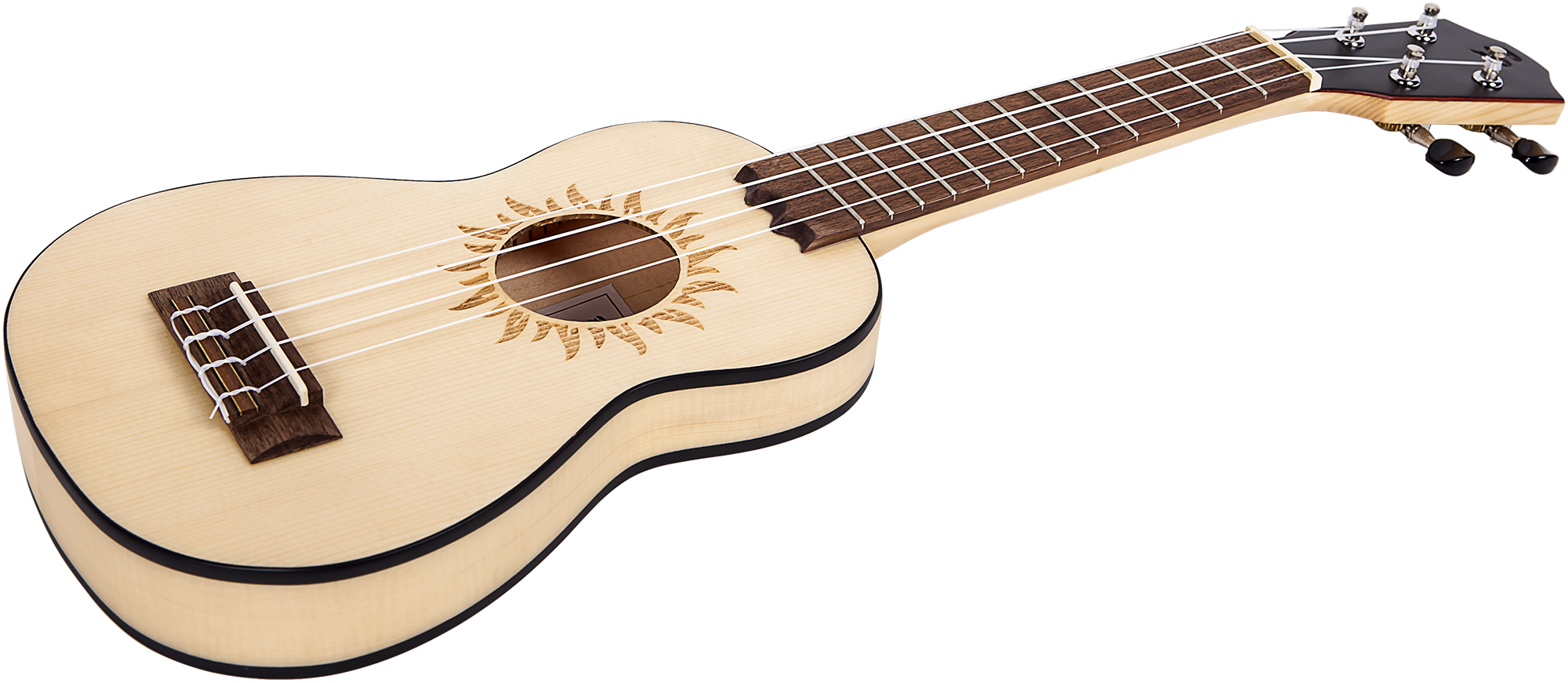 Корпус инструмента сделан из массива немецкой ели, а гриф - ламината ели. У корпуса матовое покрытие, не блокирующее поры дерева и способствующее наилучшему резонансу. Вокруг резонаторного отверстия укулеле выполнена стильная лазерная гравировка в виде солнца. По контуру корпуса имеется окантовка из пластика ABS.