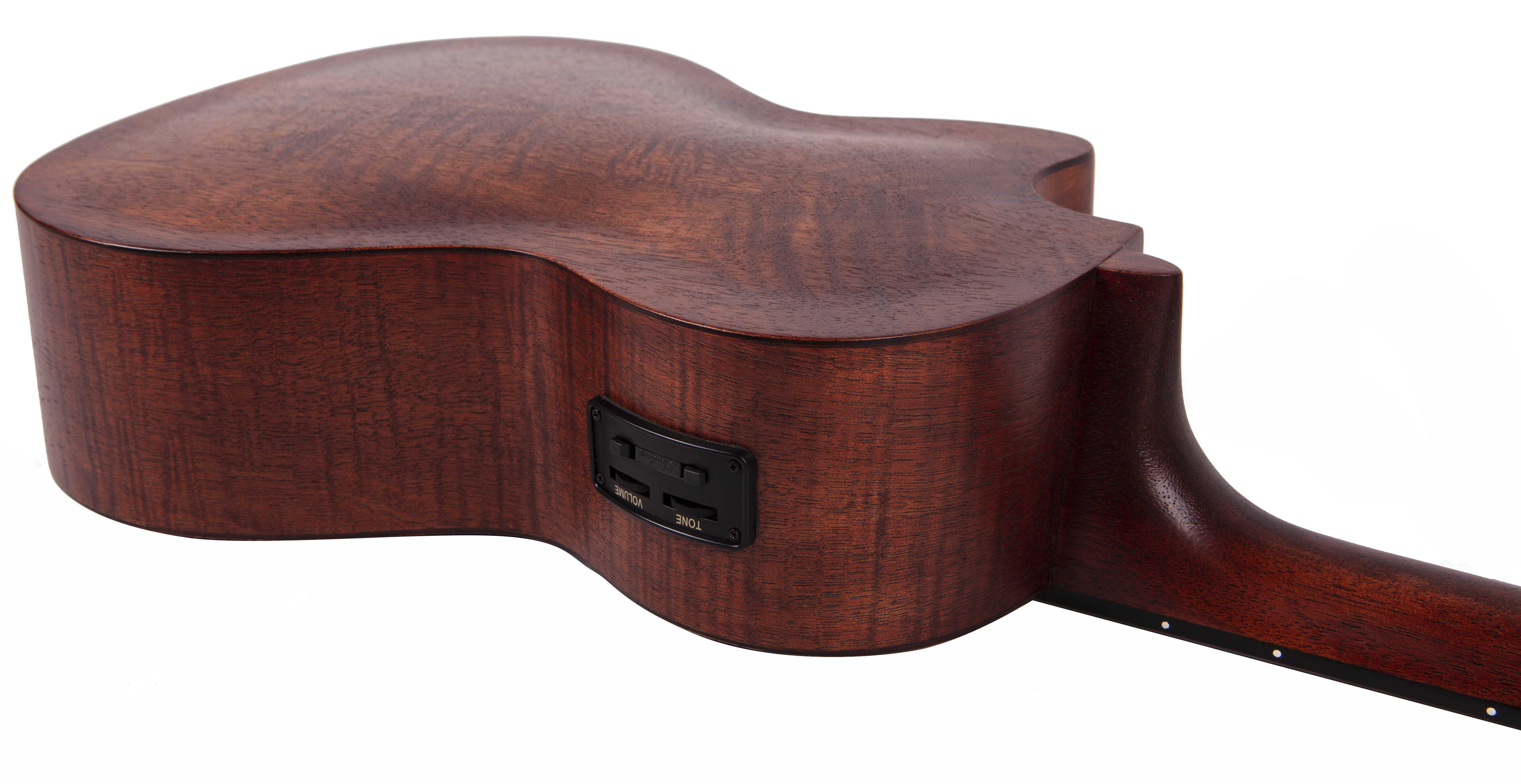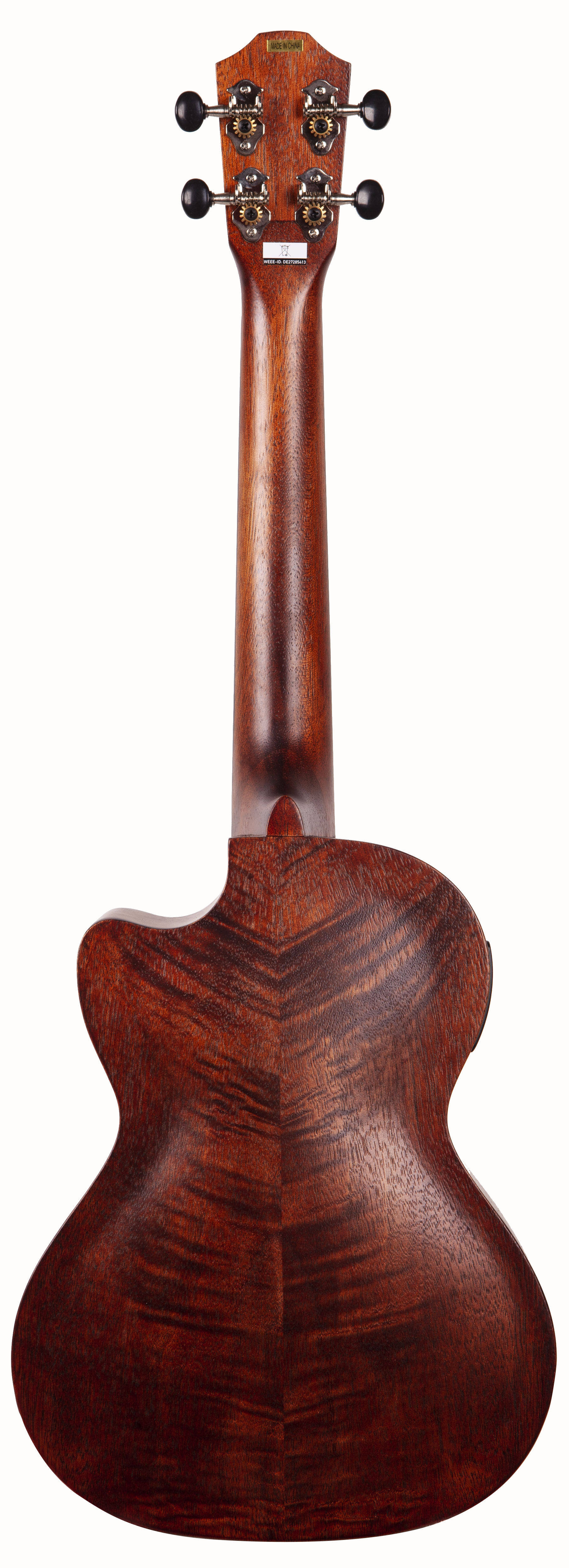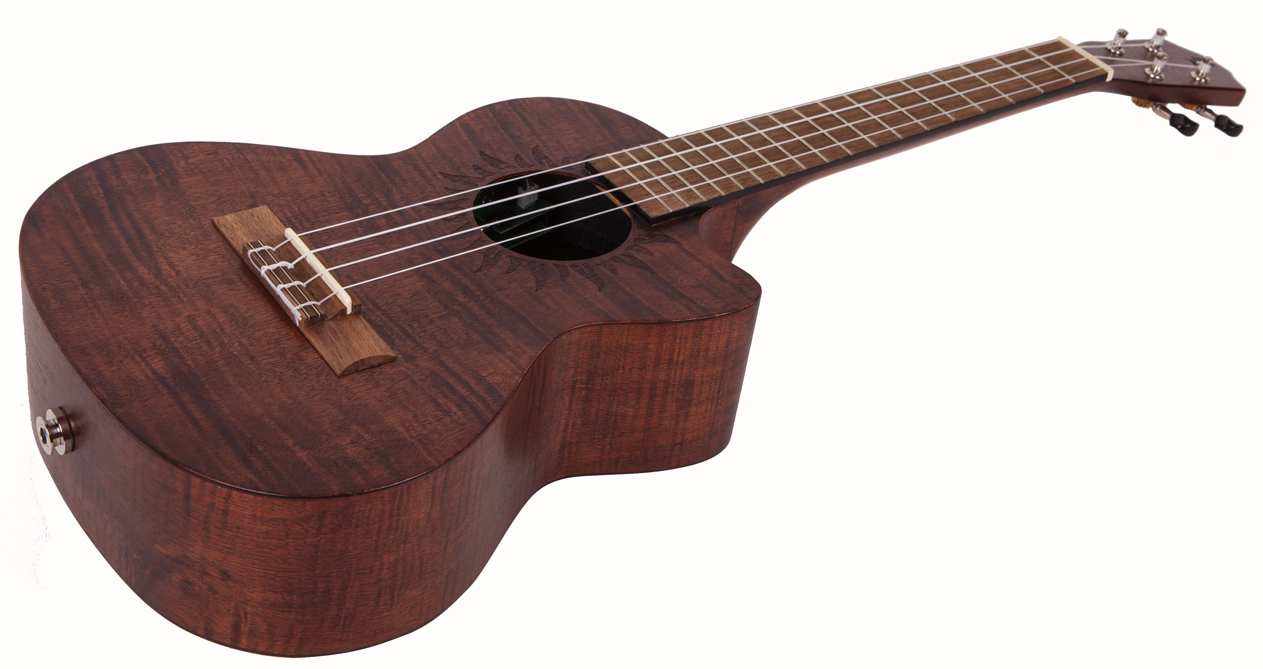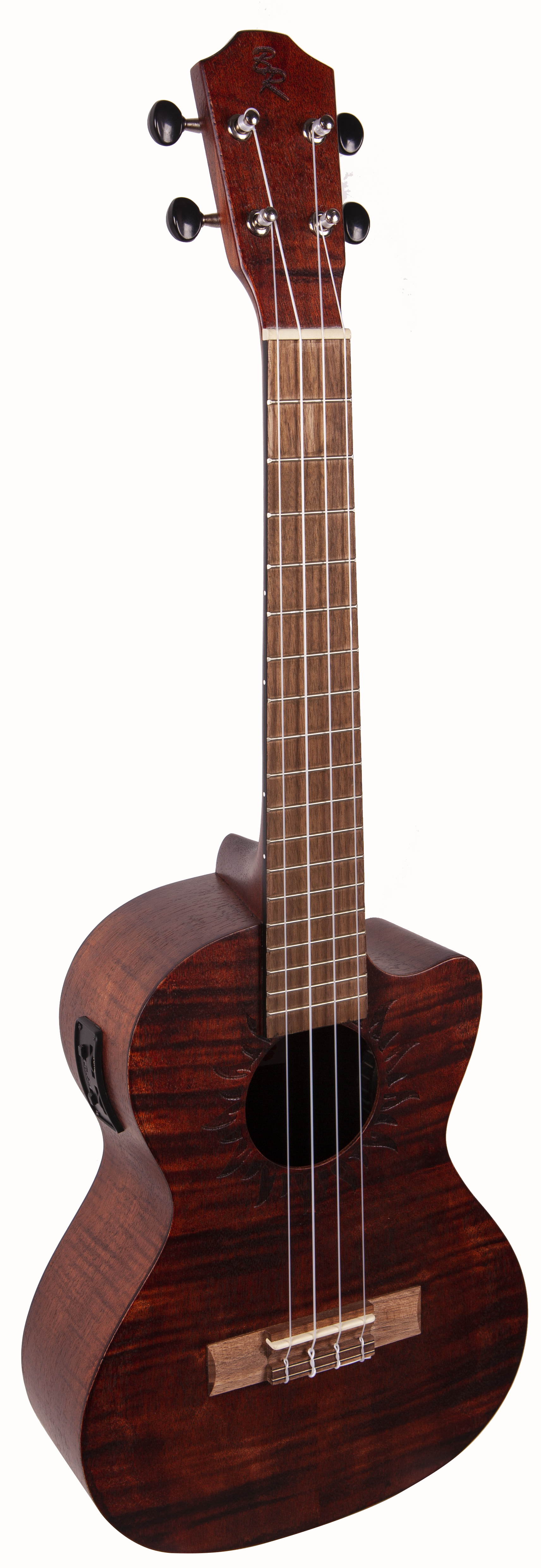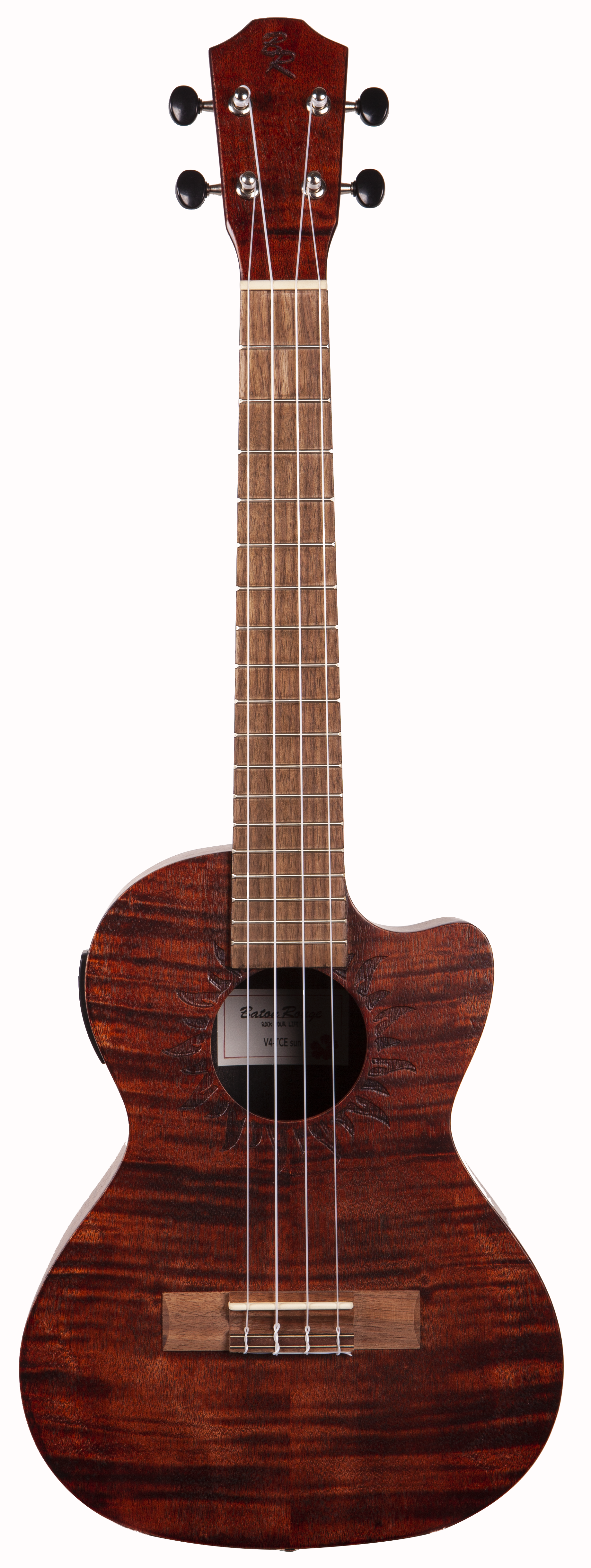 BATON ROUGE V4-TCE sun – это тенор укулеле с катавеем, чей корпус выполнен из экзотического красного дерева. У гитары традиционные 4 струны, 18 ладов и гриф из нато, а овальный вырез в центре (розетка) дополнен лазерной гравировкой солнца по периметру. Накладка на гриф и бридж выполнены и ореха. Порожек и маркеры бриджа выполнены из материала Nubone, который является разновидностью материала TUSQ с похожими тональными характеристиками, но при этом он не гасит вибрацию струн, передавая оптимальные частоты и расширяя гармоники.