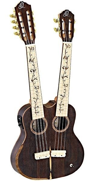 Модель Hydra оснащена двумя грифами на 8 струн и 4 струны из красного дерева, корпус размера тенор выполнен из ованкола, отделка с открытыми порами. В дополнение к этому этот уникальный инструмент оснащен уникальной электроникой Ortega с трехпозиционным мини-переключателем для переключения между грифами или одновременной игры на двух грифах.