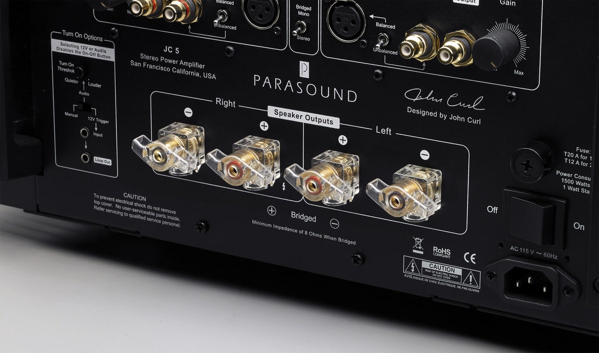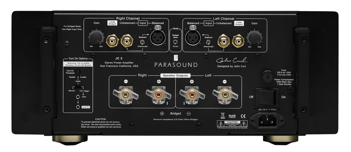 Усилитель мощности Parasound JC5 - основан на концепции моноблока JC 1. Аппарат выдает до 400 Вт на канал при сопротивлении 8 Ом, 600 Вт при 4 Ом и целых 1200 Вт/8 Ом в режиме мостового моно.Как объясняет производитель, Halo JC 5 создавался для клиентов компании, которым полюбился моноблочный усилитель Halo JC 1. Новая модель стала более доступным и компактным продолжением JC 1. Как пишет Parasound, JC 5 работает в чистом A-классе до 12 Вт на канал и «без усилий» может выдать все 400 Вт в классе AB.В блоке питания нового Halo JC 5 стоит качественный тороидальный трансформатор 1,7 кВА. В предоконечном и оконечном каскадах задействованы массивные конденсаторы Rubycon общим объемом 132 000 мкФ. Кроме того, в оконечном каскаде имеются 24 подобранных биполярных транзистора на 15 ампер, способные обеспечить ток до 90 ампер в пике.