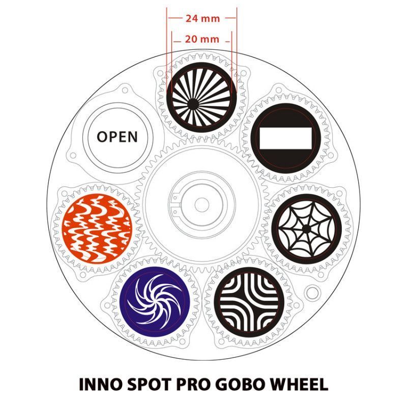 • Размер гобо: 24 мм (видимый размер – 20 мм / толщина 0,2 мм для 4 металлических гобо, толщина 1,1 мм для 2 стеклянных гобо)