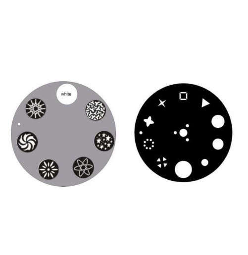 - 1 колесо гобо: 6 статичных гобо рисунков + 4 открытых, вращение колеса гобо по и против часовой стрелке, эффект тряски