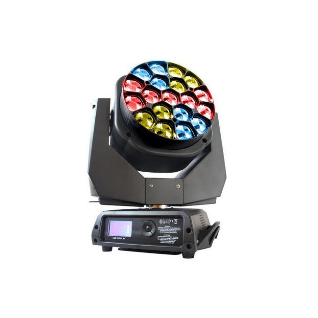 ColorWash Magic - Вращающаяся голова. Zoom: линейный от 4°до 60°, 19 высокомощных (15 Вт) светодиодов OSRAM OSTAR. Управление: DMX512 (21/35/78/97/92 + Выделенный канал для настройки цветовой температуры), звуковая активация, автоматический режим, master/slave. Габариты: 494x358x253 мм. Вес: 15 кг.
