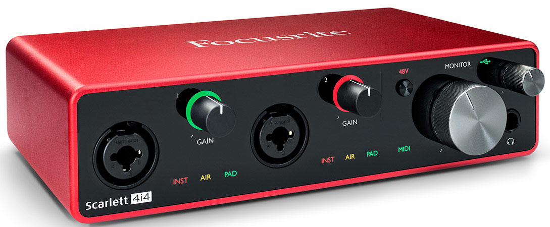 Focusrite Scarlett 4i4 3rd Gen – это профессиональный USB-аудиоинтерфейс, относящийся к третьему поколению популярной линейке звуковых карт Scarlett, которые удачно совмещают в себе невысокую цену, надежность и стабильность работы, а также высокие технические характеристики. Последний параметр особенно сильно вырос в новой ревизии аудиоинтерфейсов, что теперь позволяет осуществлять звукозапись в самых современных форматах аудио без слышимых шумов и искажений.