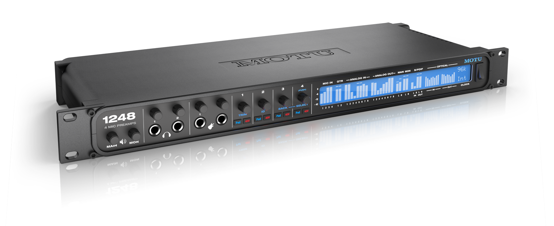 MOTU 1248 - это флагманская модель, которая по Thunderbolt или USB 2.0 подключается к ПК, в результате чего предоставляет до 32 входных и 34 выходных каналов, а также 4 микрофонных входа XLR с предусилителями, 2 инструментальных входа на передней панели (1/4″ hi-Z), 8 линейных входов (1/4″ TRS), 12 балансных линейных выходов (1/4″ TRS) и 2 выхода для наушников (1/4″ TRS). Среди цифровых коммутации имеют место 2 банка ADAT (16 каналов, оптика), банк SMUX (8 каналов, оптика) и S/PDIF (RCA). Поддерживаемые частоты дискретизации — 44.1, 48, 88.2, 96, 176.4 и 192 кГц.