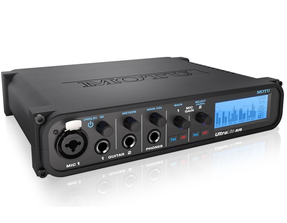 UltraLite AVB - аудио интерфейс USB 2.0, имеет 18 входов и выходов, два микрофонных и два гитарных входа, шесть линейных входов и восемь выходов, выход для наушников, сетевой интерфейс AVB, восьмиканальный цифровой интерфейс ADAT, MIDI-вход и выход, встроенный DSP, возможность беспроводного управления, компактный и прочный алюминиевый корпус.
