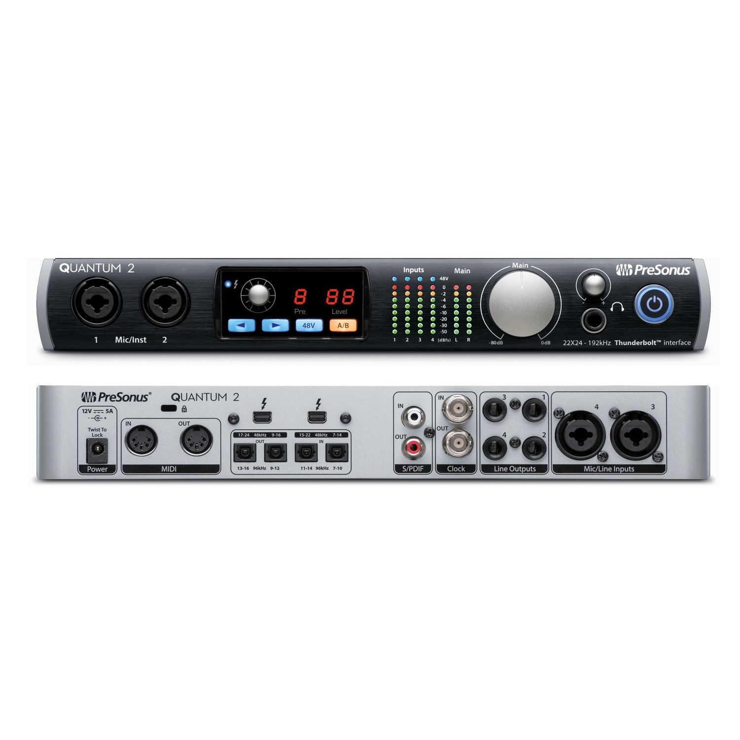 Новый звуковой интерфейс PRESONUS QUANTUM 2 является более компактной и доступной версией флагманского Thunderbolt-интерфейса PRESONUS QUANTUM. Новинка имеет меньшее число входных и выходных аудиоканалов (22 и 24 соответственно), но при этом стоит она почти в полтора раза дешевле. В отношении звука PRESONUS QUANTUM 2 не уступает своему предшественнику, так как в нем используются те же микрофонные предусилители XMAX, работающие в классе A, и те же 24-битные АЦ/ЦА-конвертеры с динамическим диапазоном в 120 дБ.