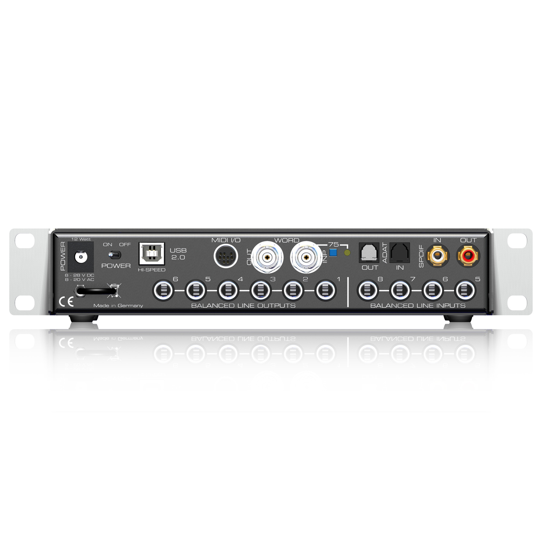 - Выходы 6 x 1/4" TRS балансные, 1 x 1/4" TRS небалансный, 1 x ADAT оптический ADAT или SPDIF, коаксиальный SPDIF (AES/EBU)