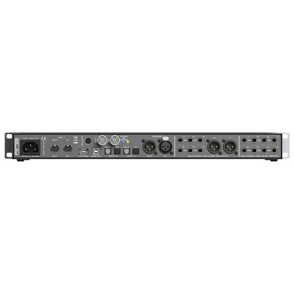 RME Fireface UFX – это 60-канальный профессиональный аудиоинтерфейс, полнофункциональная студия в формате рэкового устройства. У него 4 симметричных микрофонных/линейных входа (комбинированные разъемы XLR/TRS на передней панели, каждый использует два параллельных АЦП) со светодиодными индикаторами сигнала, 8 симметричных линейных входов TRS, 8 линейных выходов TRS и XLR, а также два выхода на наушники TRS. АЦП/ЦАП – 24 бит/192 кГц. Два восьмиканальных оптических цифровых интерфейса ADAT (96 кГц, 192 кГц), второй можно использовать как двухканальный S/PDIF (до 192 кГц).