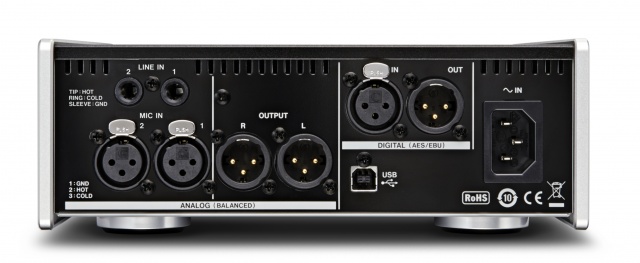 В режиме звуковой карты устройство может похвастать термостабилизированными кварцевыми генераторами со стабильностью +/1ppm. Производитель также гордится применёнными микросхемами преобразователей. В качестве АЦП используется Burr-Brown PCM4220, с динамическим диапазоном 123 дБА. ЦАП Burr-Brown PCM1795, аналогично, 123 дБА. Все входы и выходы полностью балансные. Линейный вход имеет большой запас по перегрузке (+26.5dBu). Регулятор выхода на наушники может быть переведён переключателем в режим управление уровнем линейных выходов - громкость активных мониторов будет под рукой. Помимо 2 аналоговых каналов есть и независимые цифровые AES вход/выход. Блок питания размещён внутри корпуса устройства.