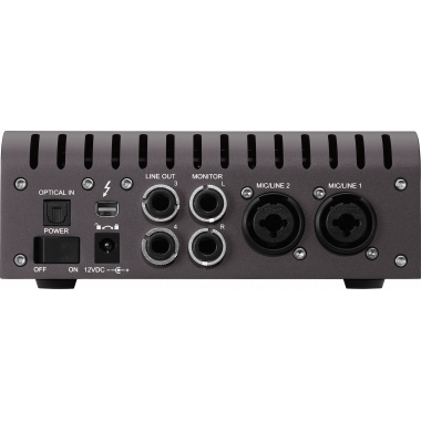 • два микрофонных/линейных входа с предусилителями премиум-класса и два линейных выхода, а также инструментальный Hi-Z вход и выход на наушники на передней панели;