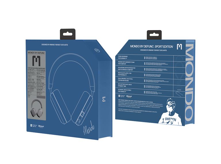 Defunc Mondo Over-Ear Headphones Sports Edition – беспроводные накладные наушники с Bluetooth aptX HD, разработанные для занятий спортом при участии легенды мировой легкой атлетики из Швеции, мирового рекордсмена по прыжкам в высоту с шестом – Армана Дюплантиса. Наушники предназначены для спортсменов, которым важны как производительность, так и комфорт.