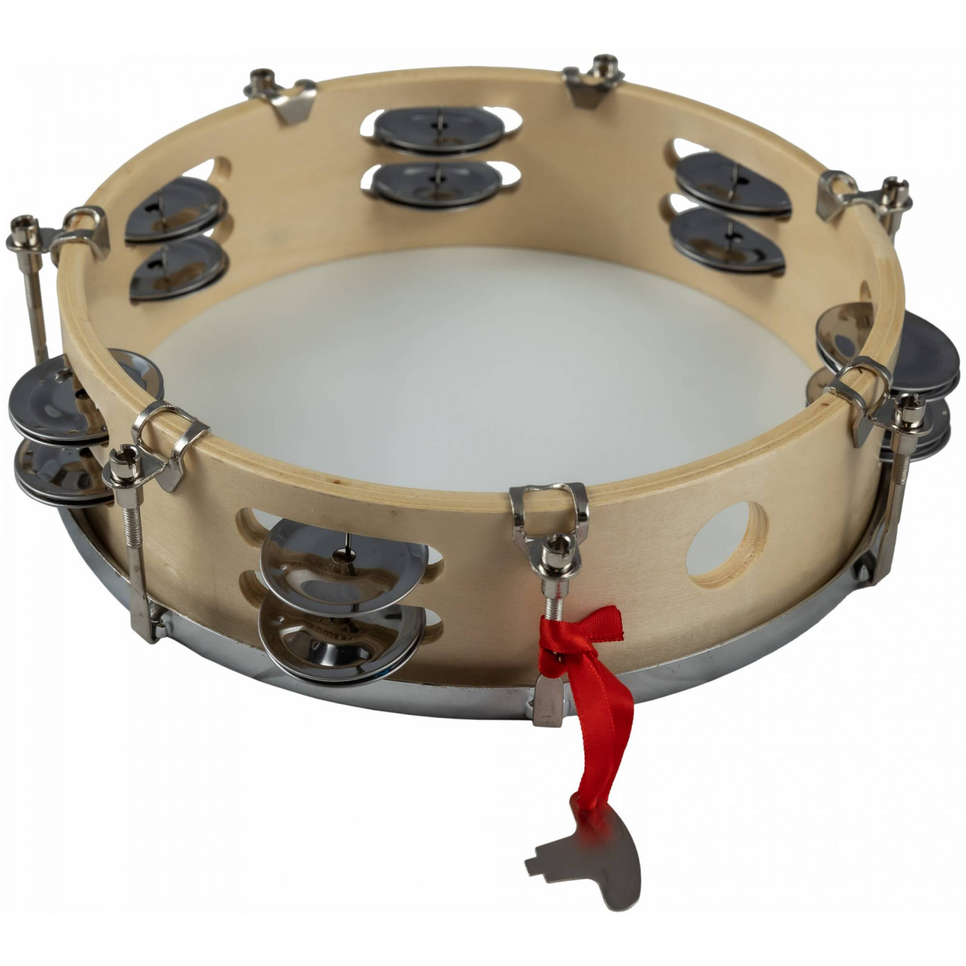 Данный тамбурин оснащен износостойким деревянным основанием, прочной синтетической мембраной и металлическими бубенцами, расположенными вдоль корпуса в два ряда. Инструмент обладает ярким и насыщенным звуком. Он выполнен в натуральном цвете и идет в комплекте с настроечным ключом.