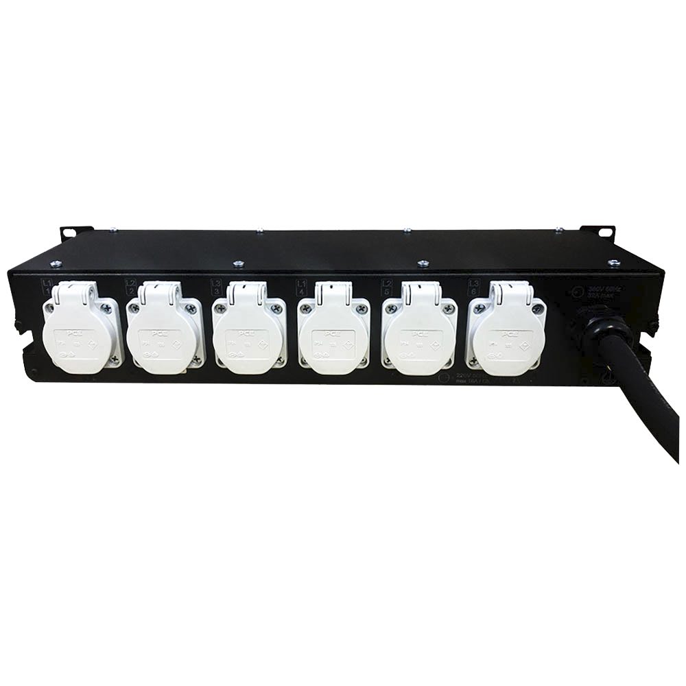 Ввод: вилка PCE CEE32A 5-pol. и 1-м. кабель H07RN-F 5G4 Выход: розетка 7хPCE Schuko16A Дополнительно: авт. выкл: Legrand 6kA 16A — 6 шт. Габариты корпуса: 482х130х89 Масса: 4,6 кг