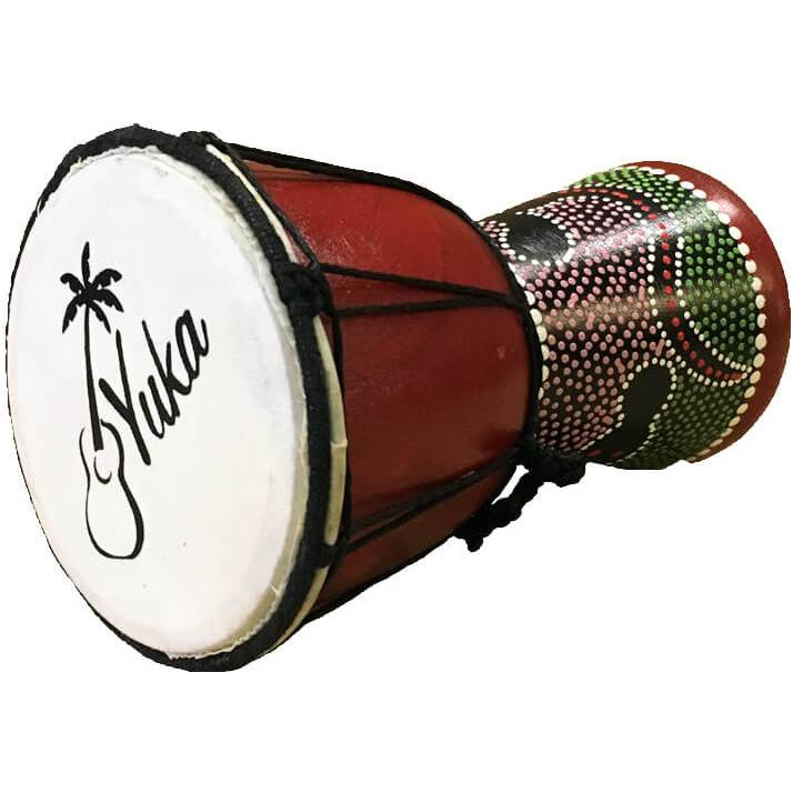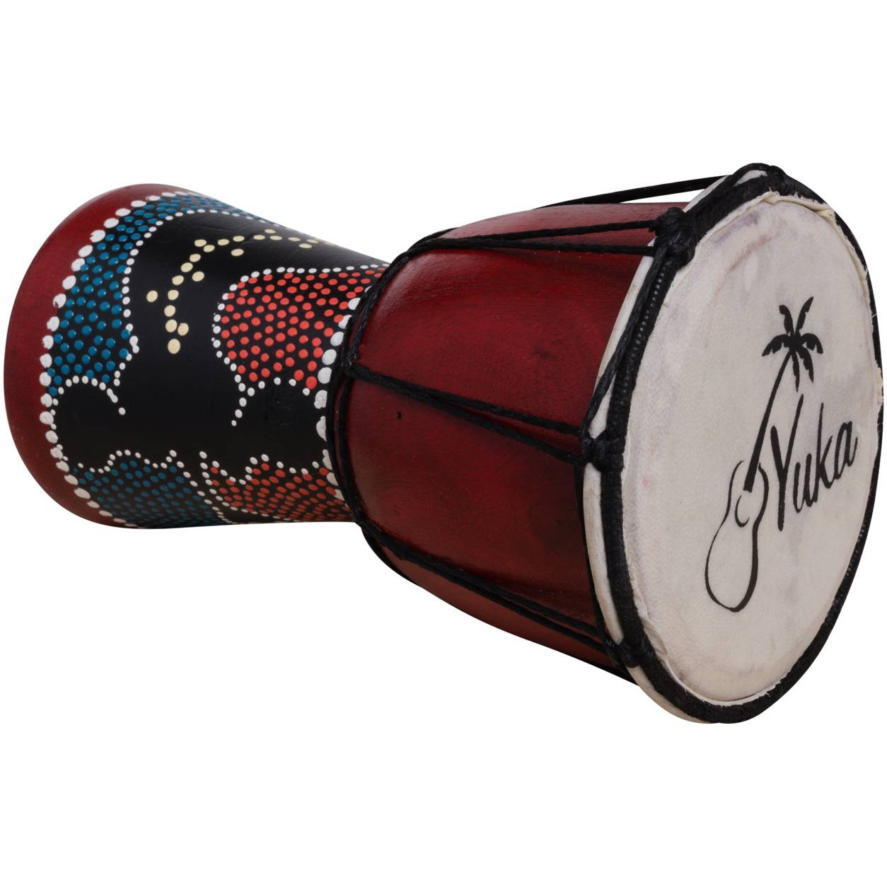 Джембе YUKA DJWK05-8 сделан из цельного куска красного дерева (Mahogany), мембрана сделана из козьей кожи. Размеры указаны примерные, поскольку изготавливается джембе из цельного куска древесины, то размер может варьироваться, особенно диаметр. Эта модель имеет миниатюрный размер (ориентировочно) - 7,5" (19 см) в высоту, диаметр мембраны (ориентировочно) - 5,5" (13,97 см). Сила натяжения мембраны регулируется с помощью нейлоновой верёвки, пропущенной через металлические кольца. Корпус украшен этнической точечной росписью.
