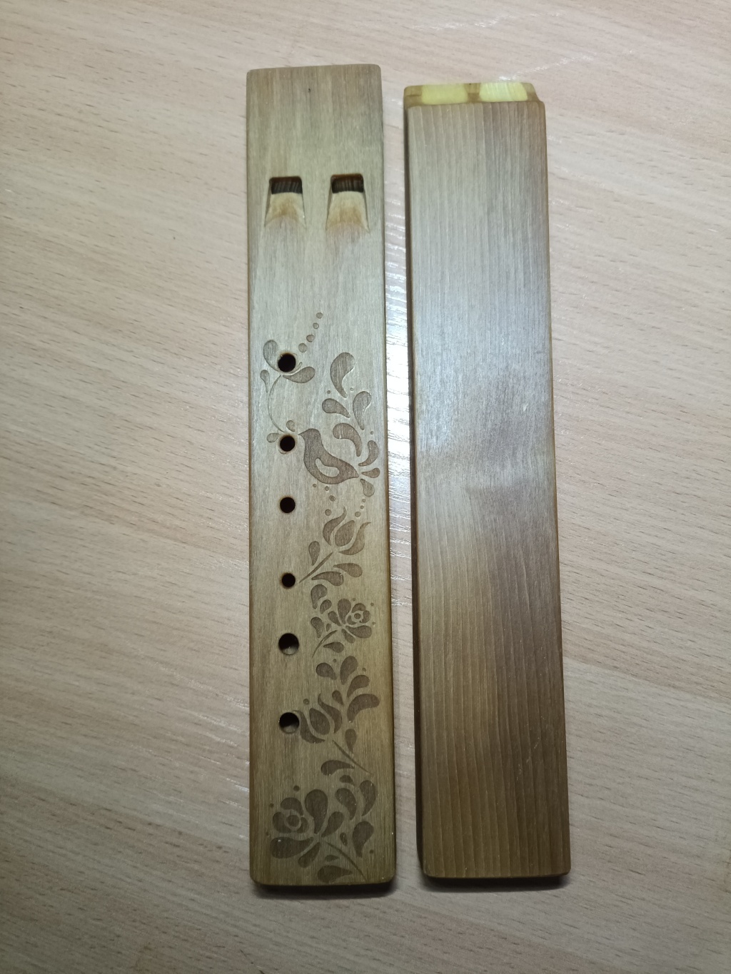 Описание:Подобный инструмент встречается во многих культурах, начиная ещё с древних времён. Двойное звучание создаёт интересный звук и добавляет объем, а наличие всего 6ти игровых отверстий даст возможность легко играть и взрослым и детям. Длина всего 22,5 см. Сама флейта состоит из двух каналов, вырезанных и проточенных в одном куске дерева, что делает инструмент прочным. Это же даёт вариантивность для исполнителя – дуть в один, или в оба канала одновременно. На одной флейте есть игровые отверстия для исполнения мелодической линии. На второй - одно для получения постоянного (бурдонного) тона. Строй Диатонический от ноты Соль (самый низкий тон при всех закрытых отверстиях).