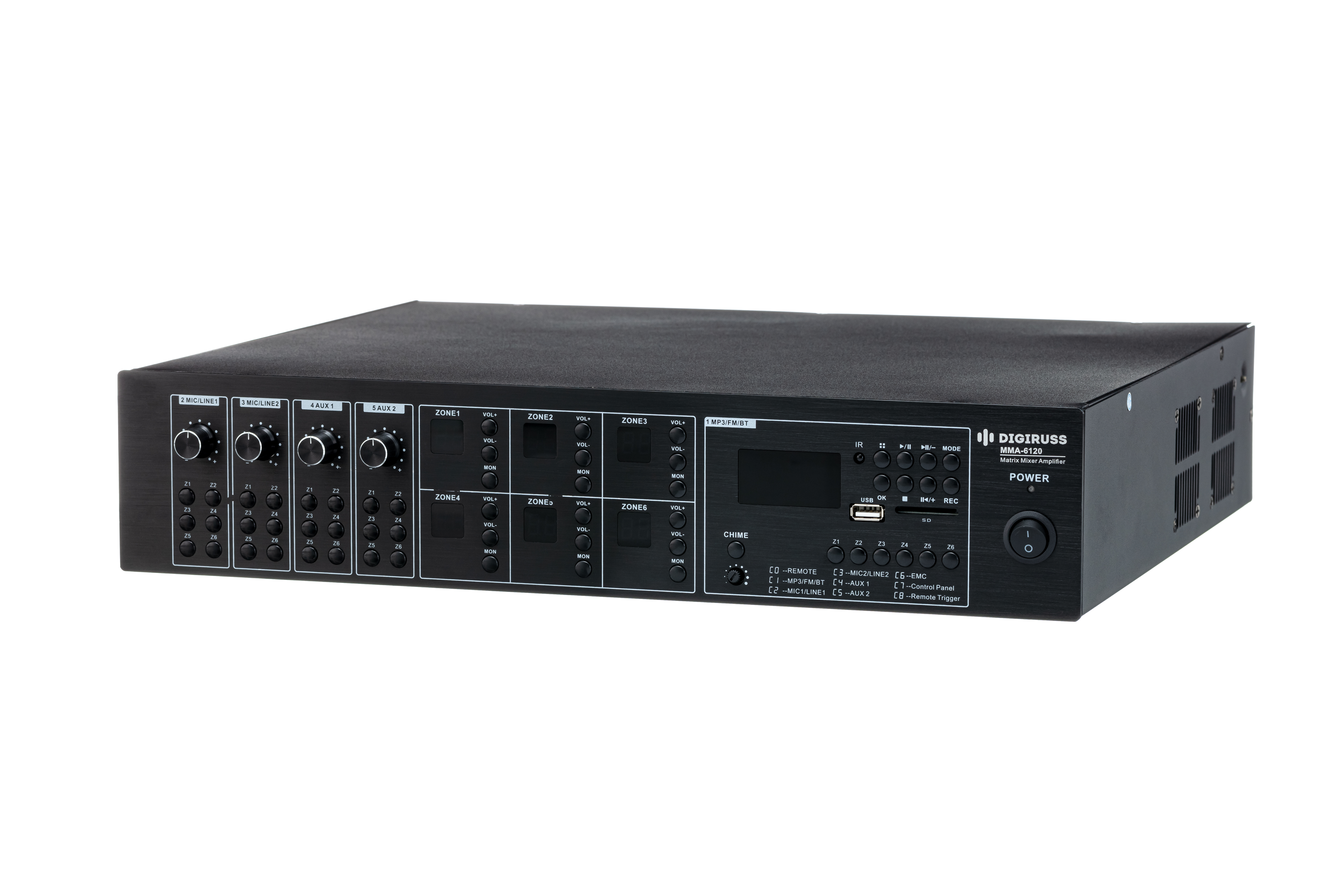 MMA-6120 — Матричный микшер-усилитель мощностью 6 × 120 Вт, работающий в системах 100 В или в системах 4/8 Ом. Оснащен встроенным MP3-плеером с USB/SD, FM-тюнером и Bluetooth для разнообразных вариантов воспроизведения. Частотный диапазон охватывает значения от 80 до 16 кГц, обеспечивая передачу звукового сигнала в широком спектре частот.